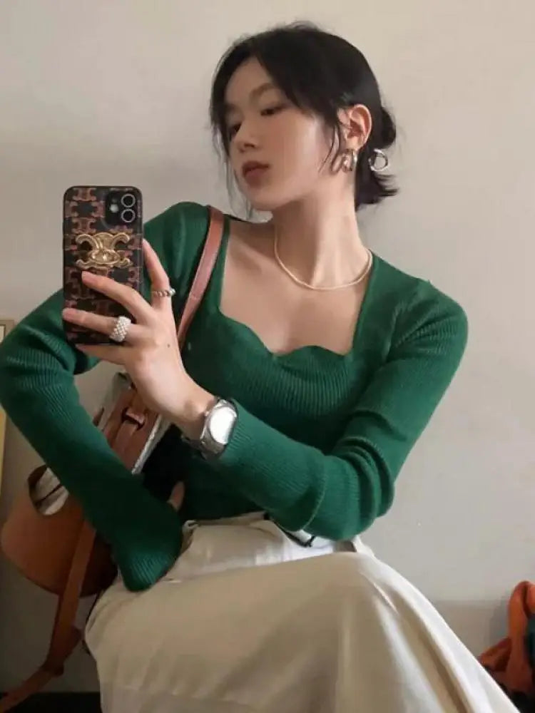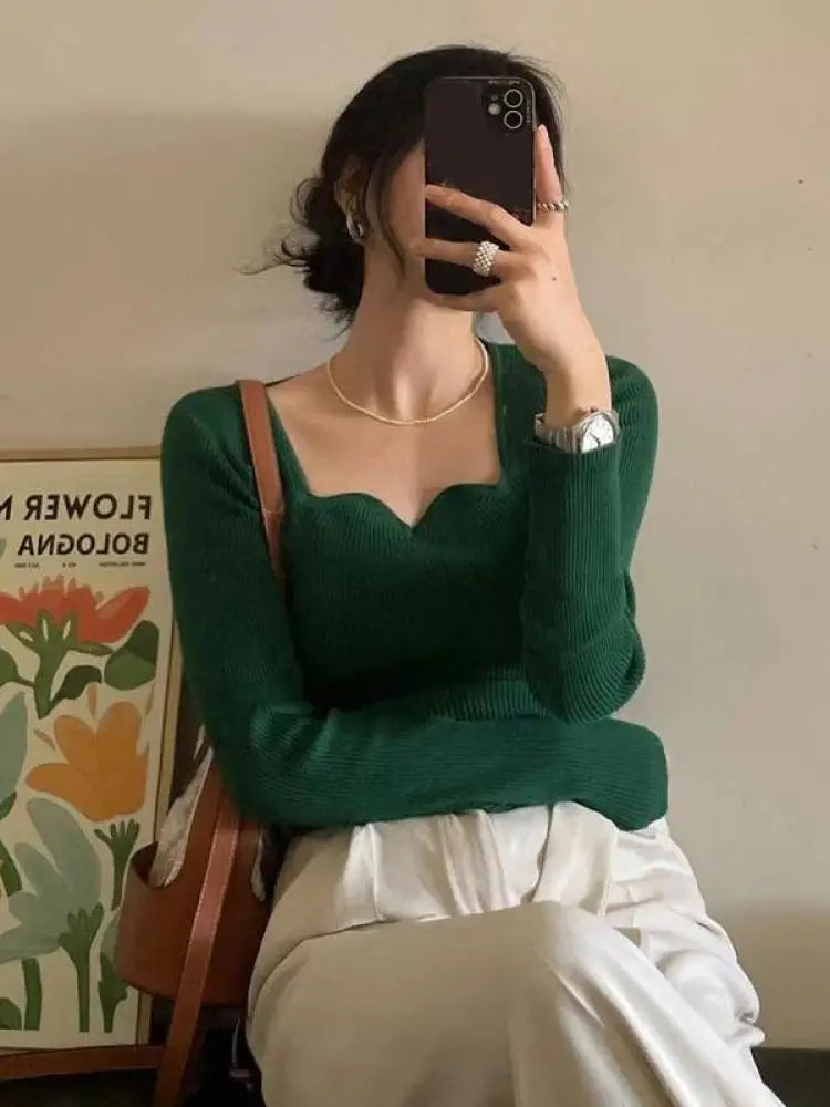 Knitted Pullovers Women Vintage Solid Sweaters Autumn Winter Korean Elegant Slim Knitwear Square Collar All Match Jumpers New