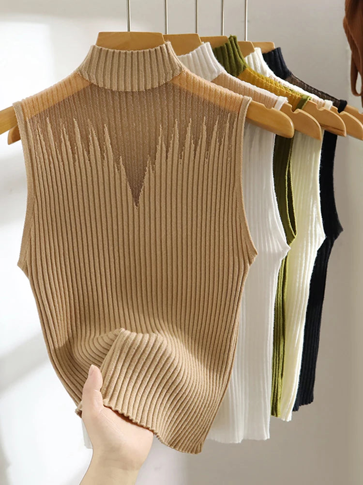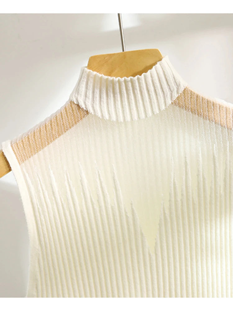Mesh Knitted Top Women Y2K Tank Top Half Neck Vest Female Sleeveless Sweater Chic Cut Out Streetwear Solid Skinny White Tube