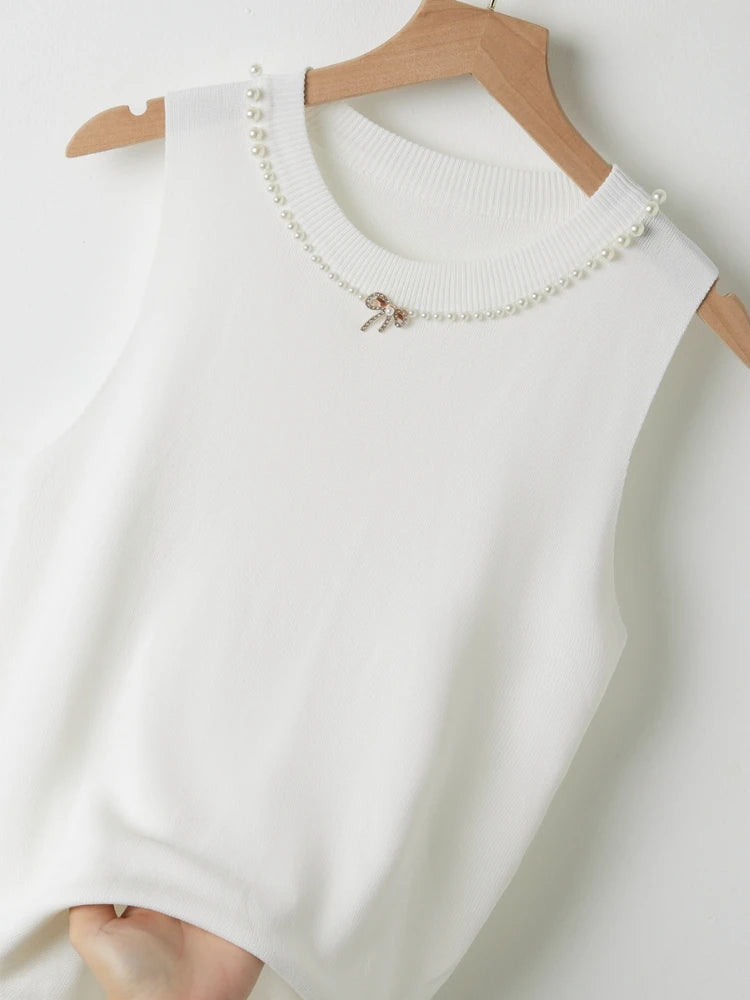 2025 Korea Summer New Fashion Female Sleeveless Beading Casual Thin Tops Knitted Vests Women Top Solid Tank Blusas Mujer De Moda
