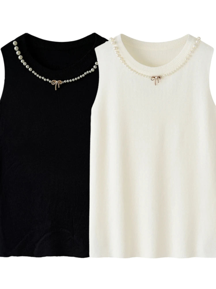 AOSSVIAO 2025 Korea Knitted T-shirt Women Top Solid Tank Y2K Summer New Fashion Female Sleeveless Beading Casual Thin Tops